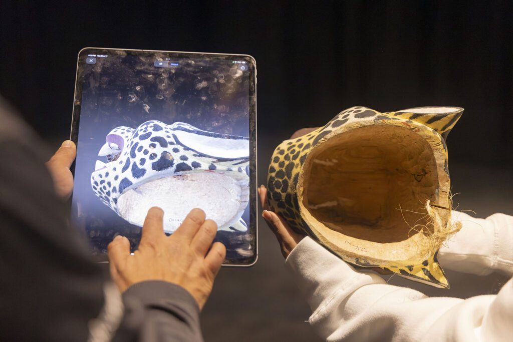 Apple includes robust Augmented Reality (AR) features into their iPhone and iPad. This link will send a file to your device that launches an AR display. Once the file is downloaded and the device camera is looking for a flat surface, view an open space and the exhibit will be projected on the device. Touch the virtual button to cycle through some of the masks. Touch the mask itself to go from a flat to stand-up views.